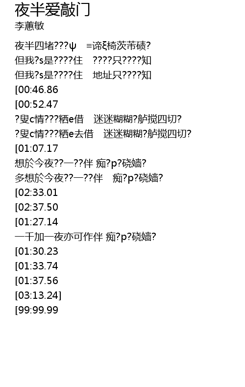 | [02:05.55][00:52.47] | 是夜???l伴我野 ?楹我估p住我半斜 |