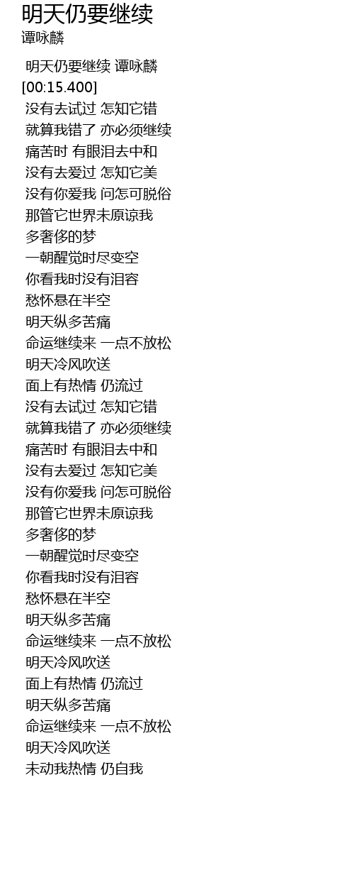 | [00:02.400] | 明天仍要继续 谭咏麟 |