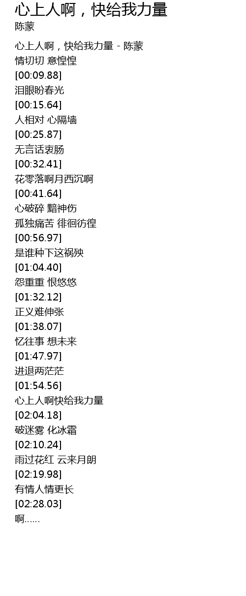 | [00:00.95] | 心上人啊,快给我力量 - 陈蒙 |