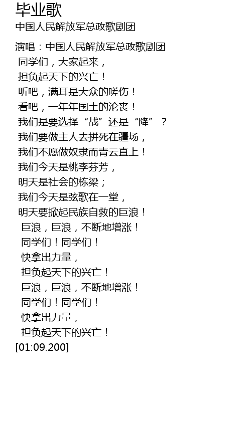 | [00:00.900] | yǎn chàng: zhōng guó rén mín jiě fàng jūn zǒng zhèng gē jù tuán |