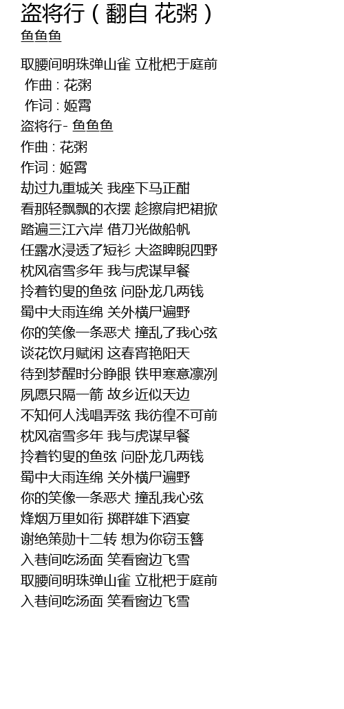 | [00:09.687] | 盗将行- 鱼鱼鱼 |