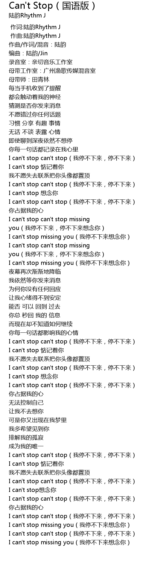 | [01:42.538] | I can' t stop can' t stop missing you wǒ tíng bù xià lái, tíng bù xià lái xiǎng niàn nǐ |