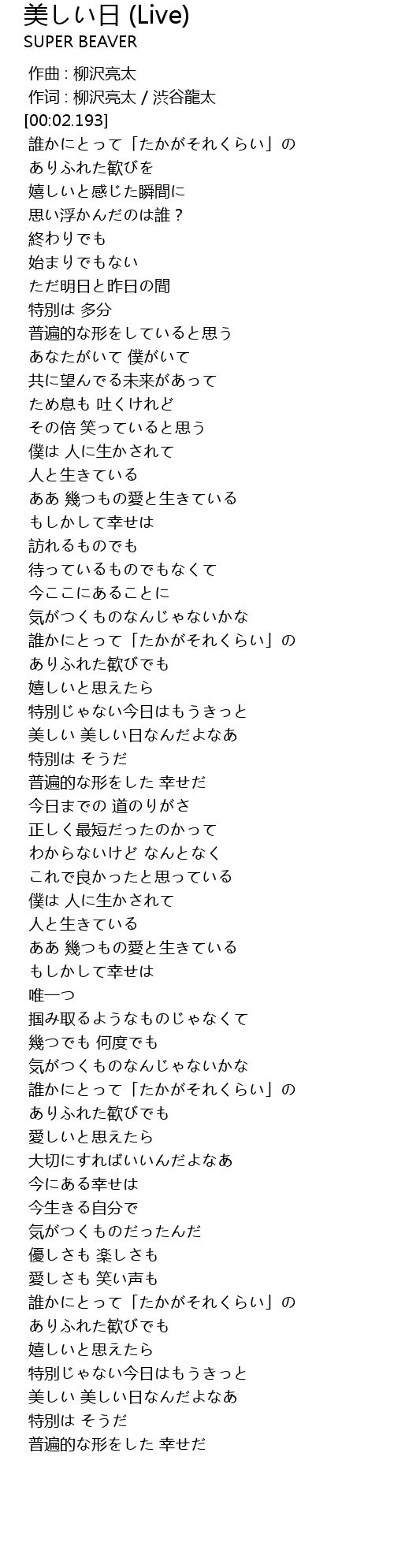 | [01:30.285] | 美しい 美しい日なんだよなあ |