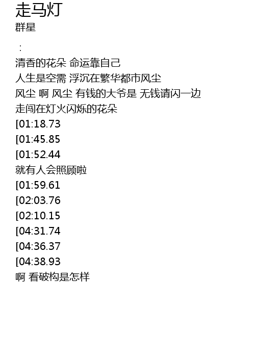 | [04:50.19][04:36.37][04:22.13][03:54.32][03:40.07][02:34.36][02:18.74] | 亲像走马灯 |