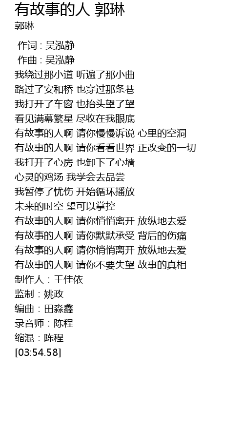 | [03:03.03] | 有故事的人啊 请你不要失望 故事的真相 |