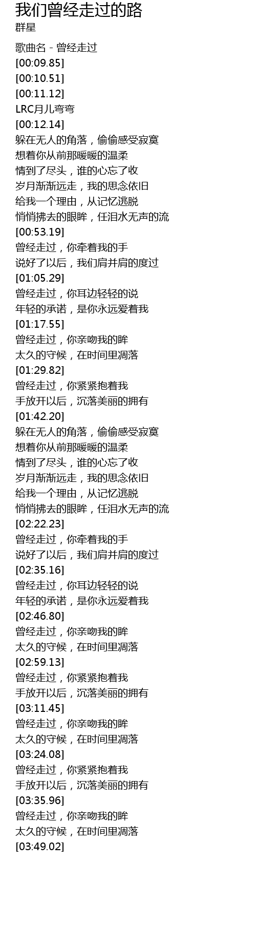 | [00:53.54] | céng jīng zǒu guò, nǐ qiān zhe wǒ de shǒu |
