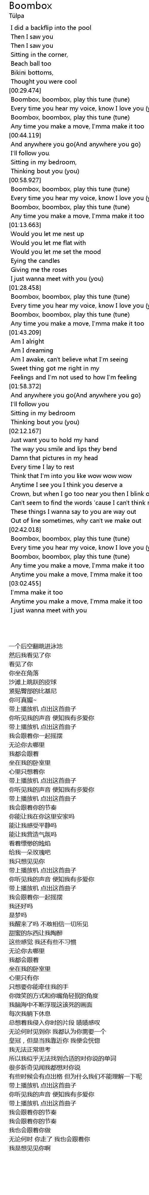 | [00:36.765] | Boombox, boombox, play this tune (tune) |