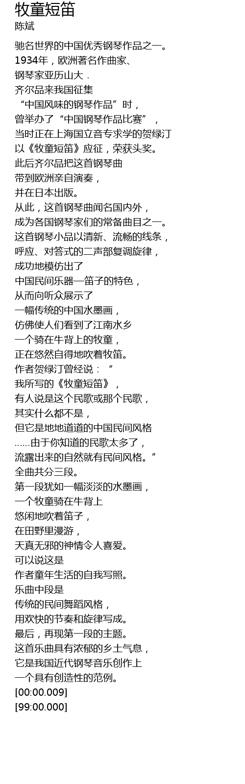 | [00:35.37] | 以《牧童短笛》应征,荣获头奖。 |