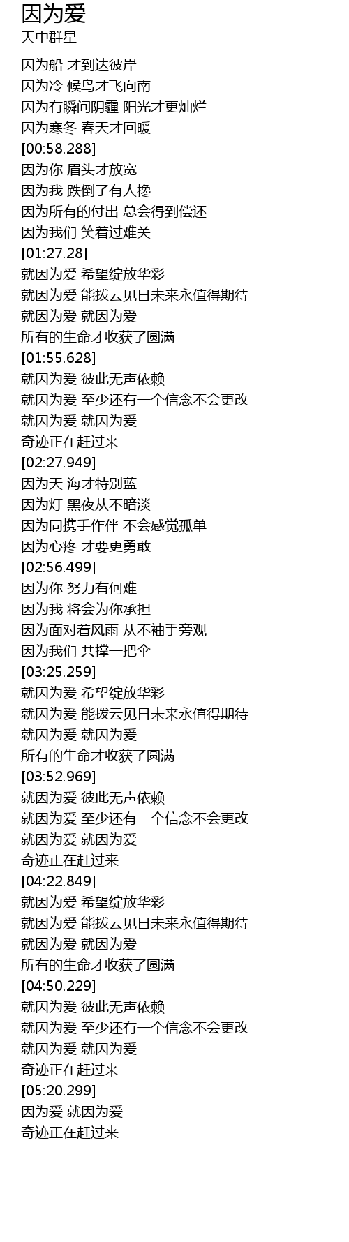 | [04:58.749] | 就因为爱 至少还有一个信念不会更改 |