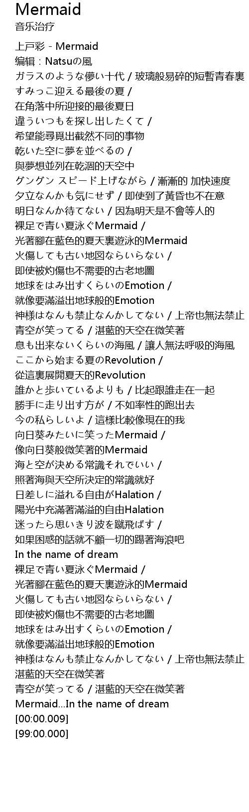 | [02:53.78] | 裸足で青い夏泳ぐMermaid / 光著腳在藍色的夏天裏遊泳的Mermaid |