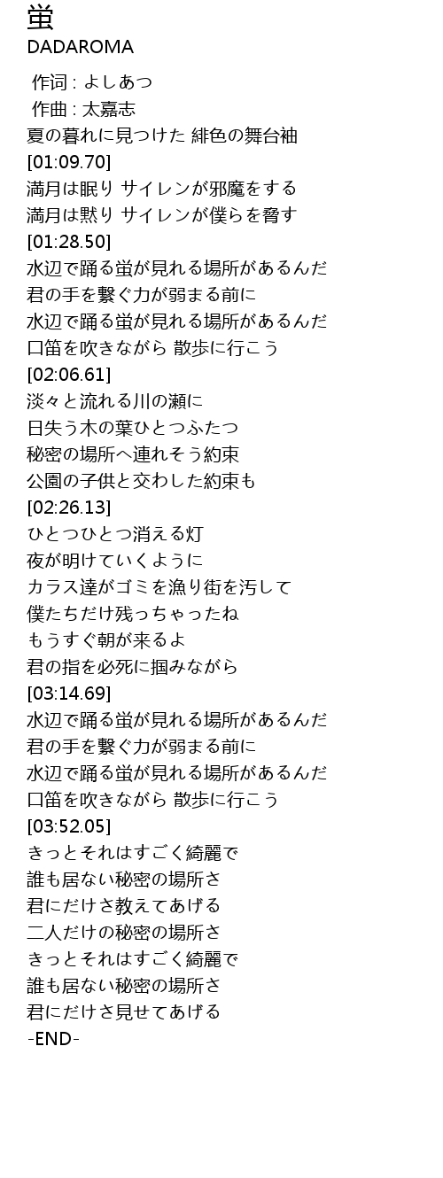| [01:48.05] | 水辺で踊る蛍が見れる場所があるんだ |