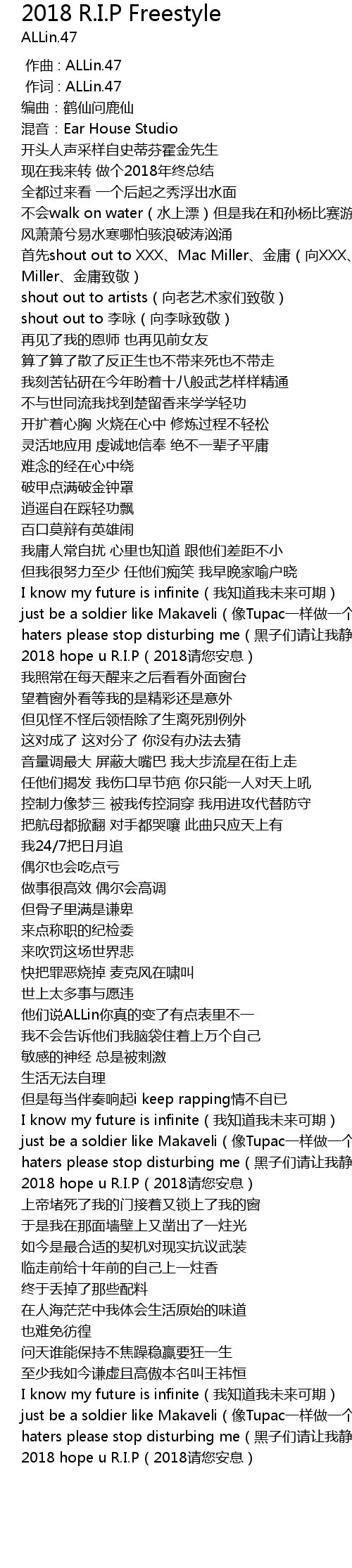 | [00:41.419] | 首先shout out to XXX、Mac Miller、金庸(向XXX、Mac Miller、金庸致敬) |