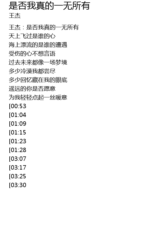 | [00:00] | 王杰:是否我真的一无所有 |