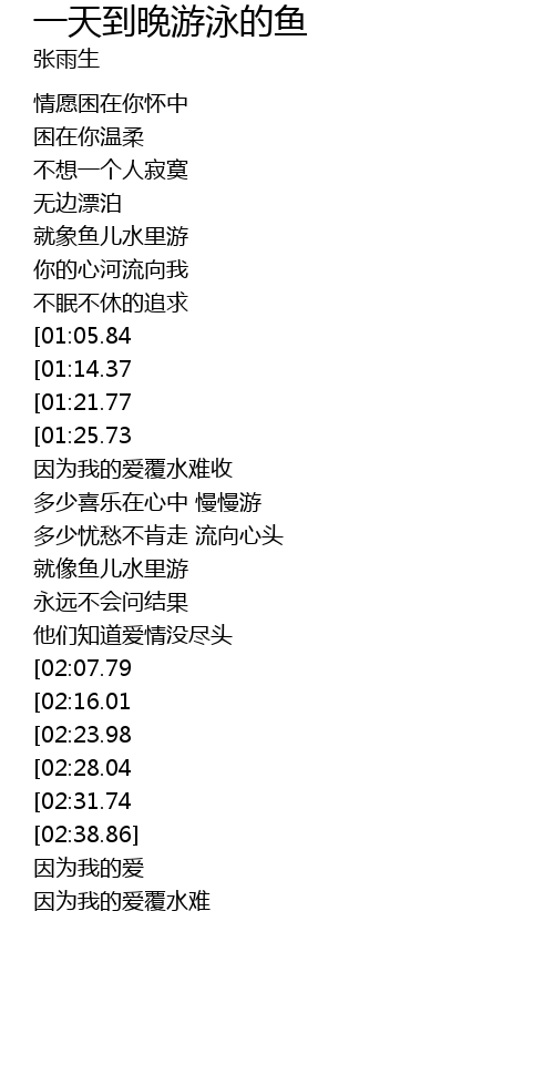 | [03:41.91][01:05.84] | 一天到晚游泳的鱼啊鱼不停游 |