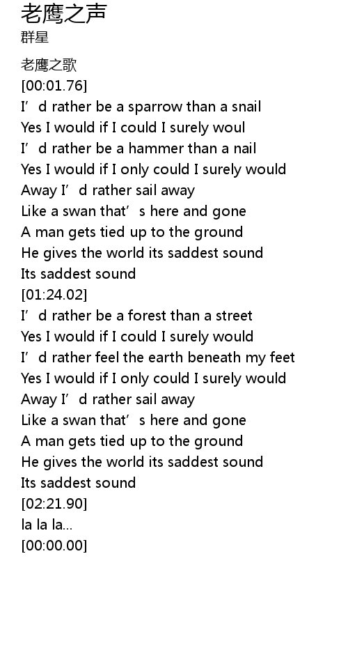| [00:18.18] | I' d rather be a sparrow than a snail |