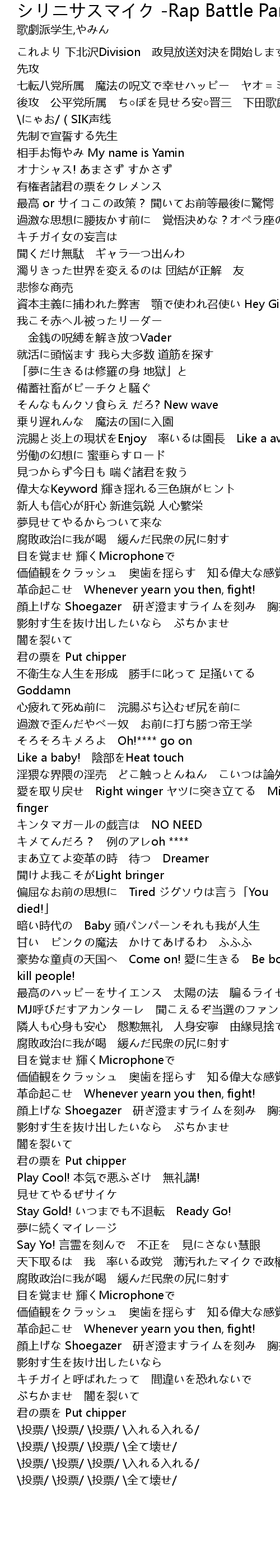| [00:00.00] | これより 下北沢Division 政見放送対決を開始します |