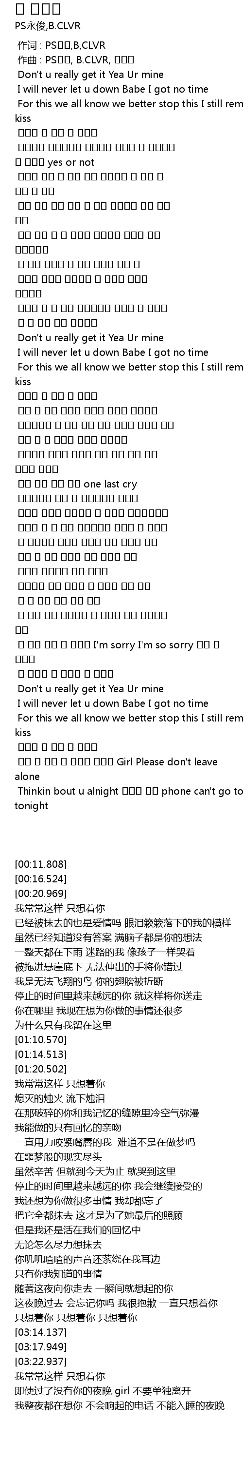 | [03:42.395] | Thinkin bout u alnight 울리지 않는 phone can't go to sleep tonight |