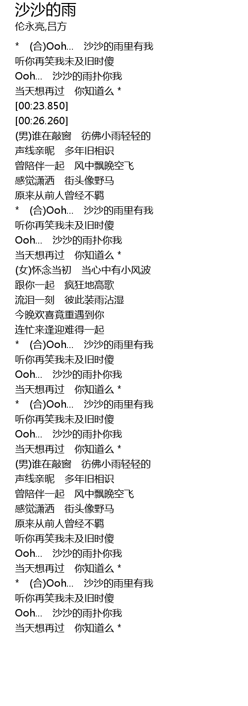 | [02:24.260] | * (合)Ooh... 沙沙的雨里有我 |