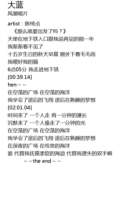 | [01:39.81] | 在空荡的广场 在空荡的海洋 |