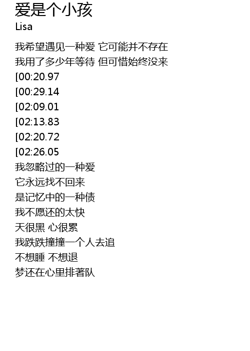 | [02:29.13][02:09.01][01:27.77][00:35.66] | 爱 是躲在心中的小孩 |