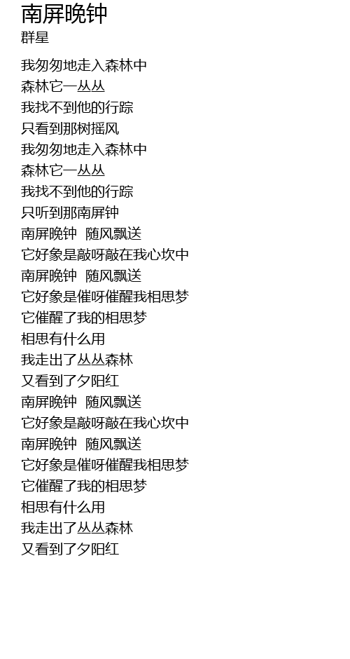| [00:15.0] | wǒ cōng cōng dì zǒu rù sēn lín zhōng |