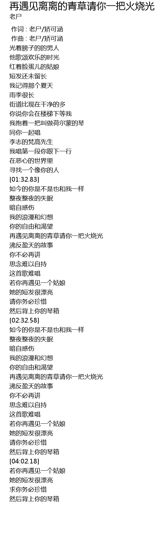 | [01:55.58] | 再遇见离离的青草请你一把火烧光 |