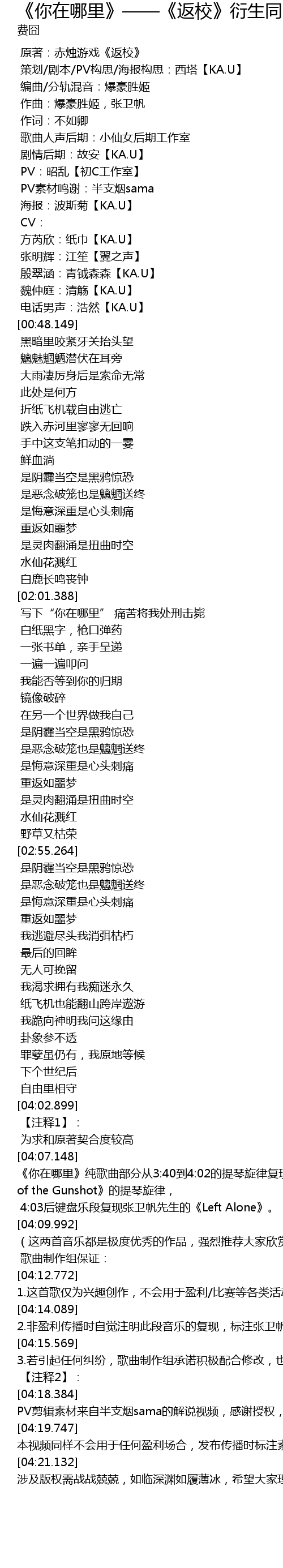 | [04:07.148] | 《你在哪里》纯歌曲部分从3:40到4:02的提琴旋律复现张卫帆先生在《返校》游戏OST中《Sound of the Gunshot》的提琴旋律, |