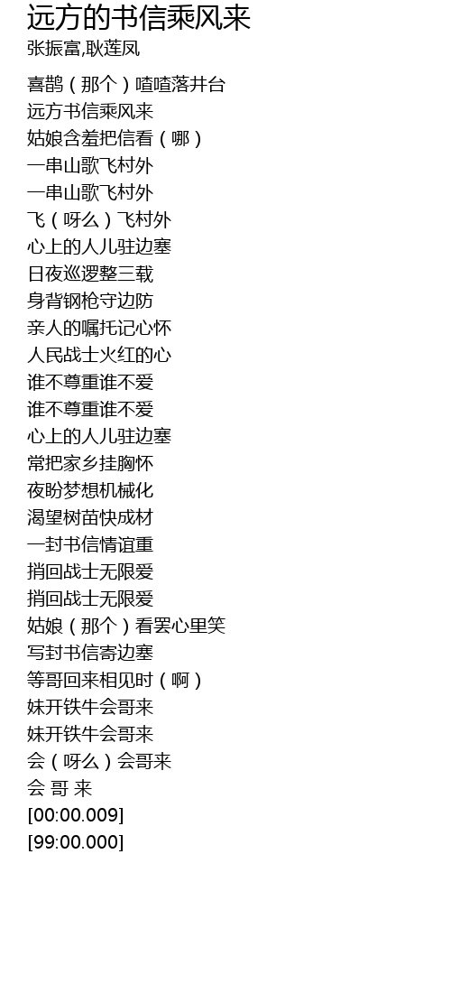 | [00:41.16] | yuǎn fāng shū xìn chéng fēng lái |