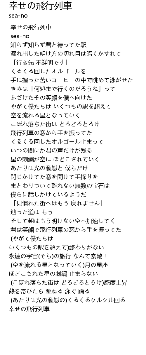 | [03:30.210] | (あたりは光の動態の)くるくるクルクル回る 幸せの飛行列車 |