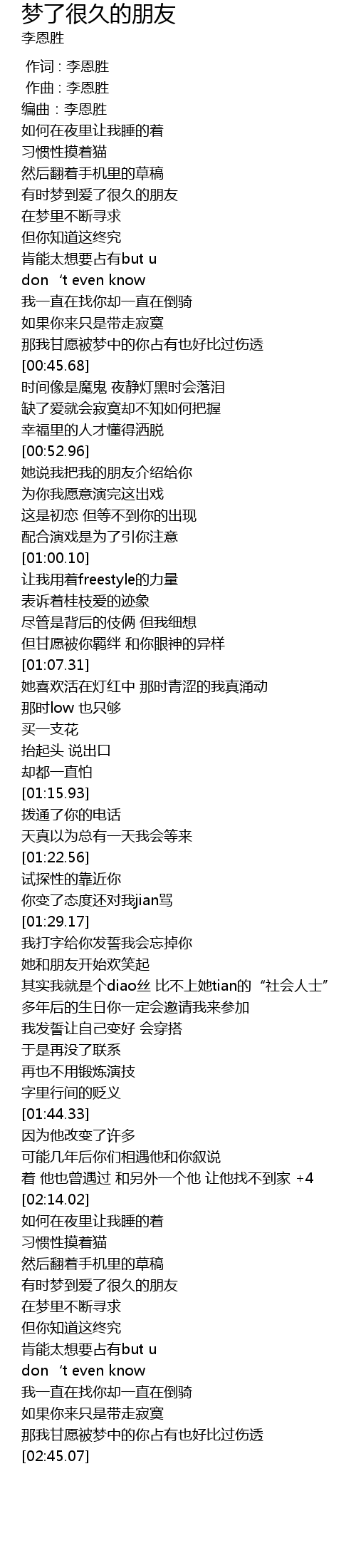 | [02:20.86] | yǒu shí mèng dào ài le hěn jiǔ de péng yǒu |