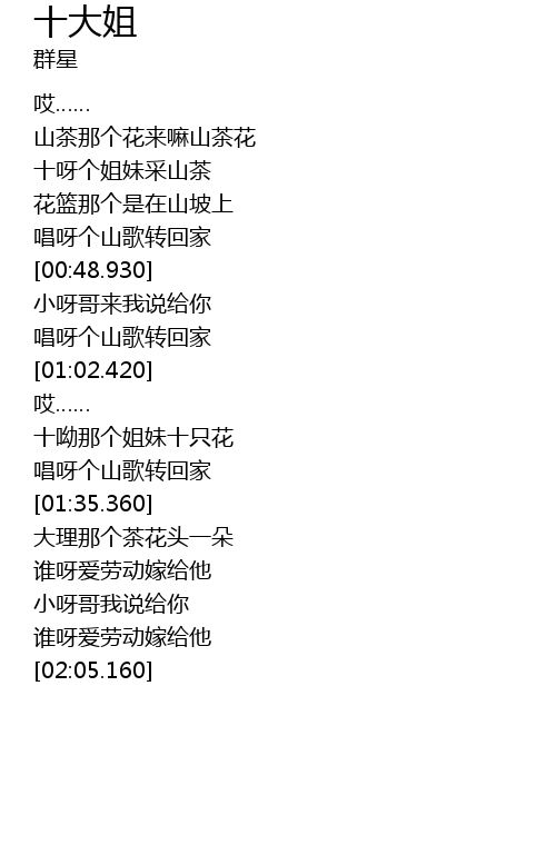 | [01:36.090] | 大理那个茶花头一朵 |
