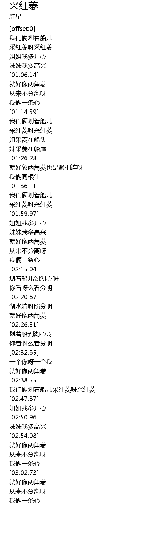 | [02:41.69] | 我们俩划着船儿采红菱呀采红菱 |