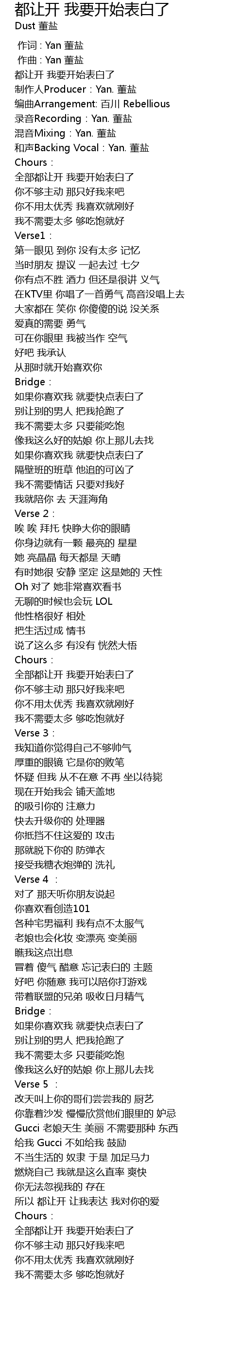 | [00:09.282] | dōu ràng kāi wǒ yào kāi shǐ biǎo bái le |