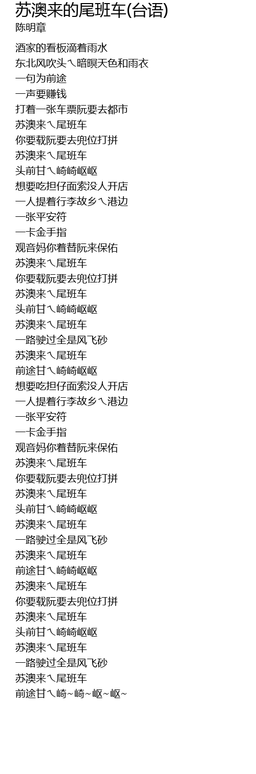 | [01:36.100] | 苏澳来ㄟ尾班车 |