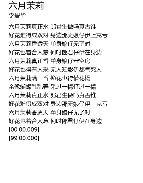 | [00:16.87] | 六月茉莉真正水 郎君生做吗真古锥 |