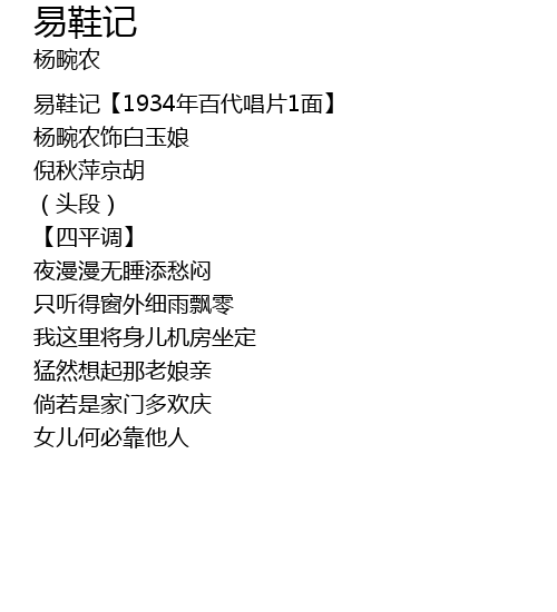 | [00:00.20] | 易鞋记【1934年百代唱片1面】 |