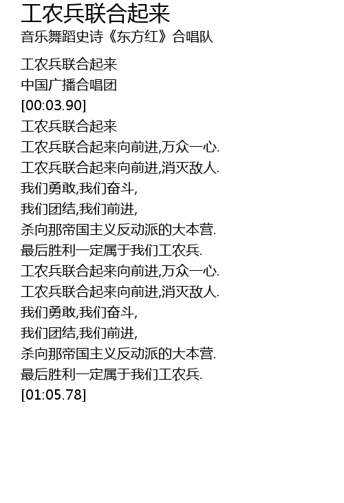 | [00:11.28] | gōng nóng bīng lián hé qǐ lái xiàng qián jìn, wàn zhòng yī xīn. |