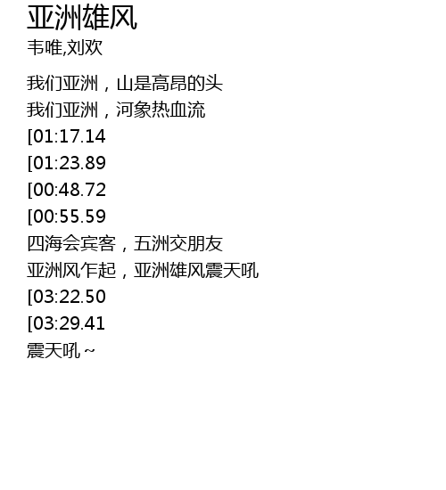 | [01:37.86] | 亚洲风乍起,亚洲雄风震天吼 |