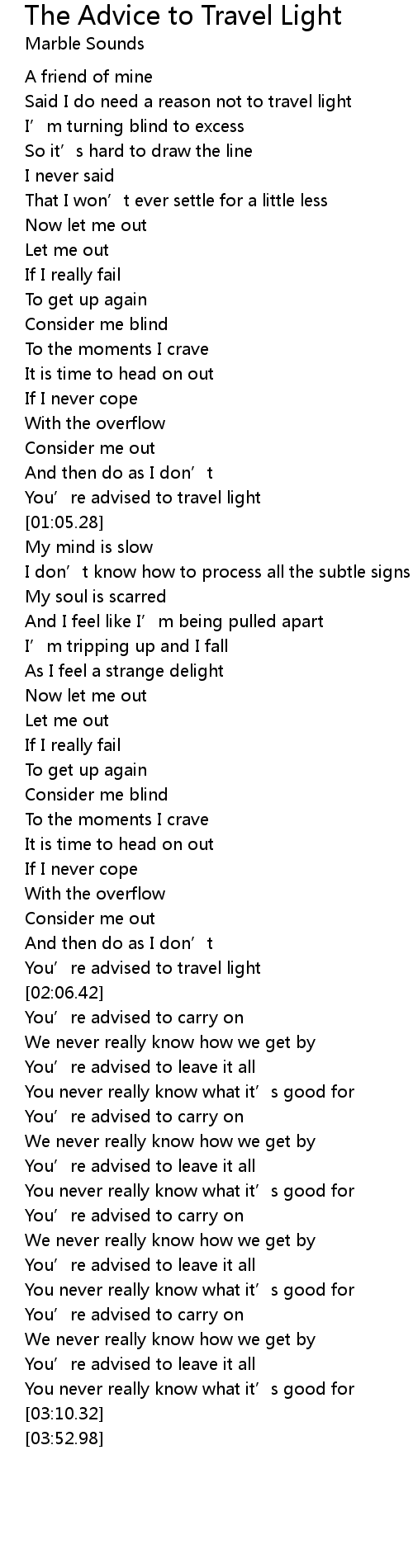| [00:59.66] | You’re advised to travel light |