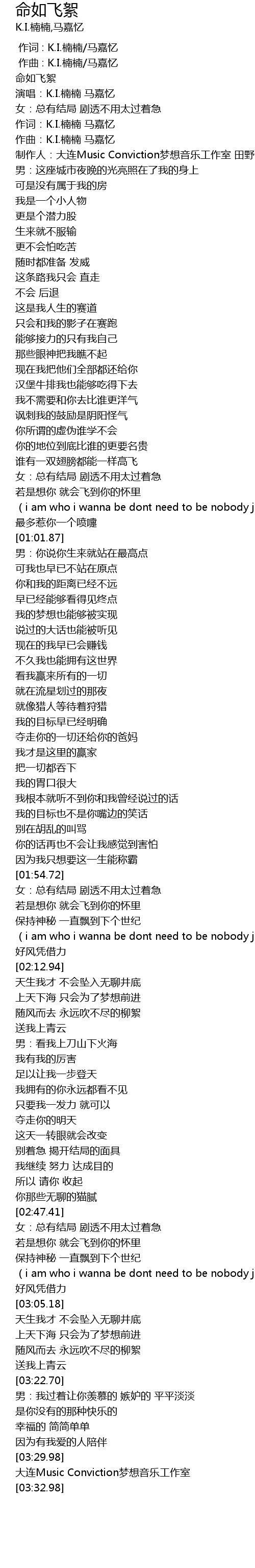 | [03:01.00] | (i am who i wanna be dont need to be nobody just be me) |