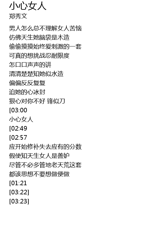 | [03:07][03:00][02:53][02:45][02:09][02:02][01:11][01:03] | 你要小心女人 小心女人 |