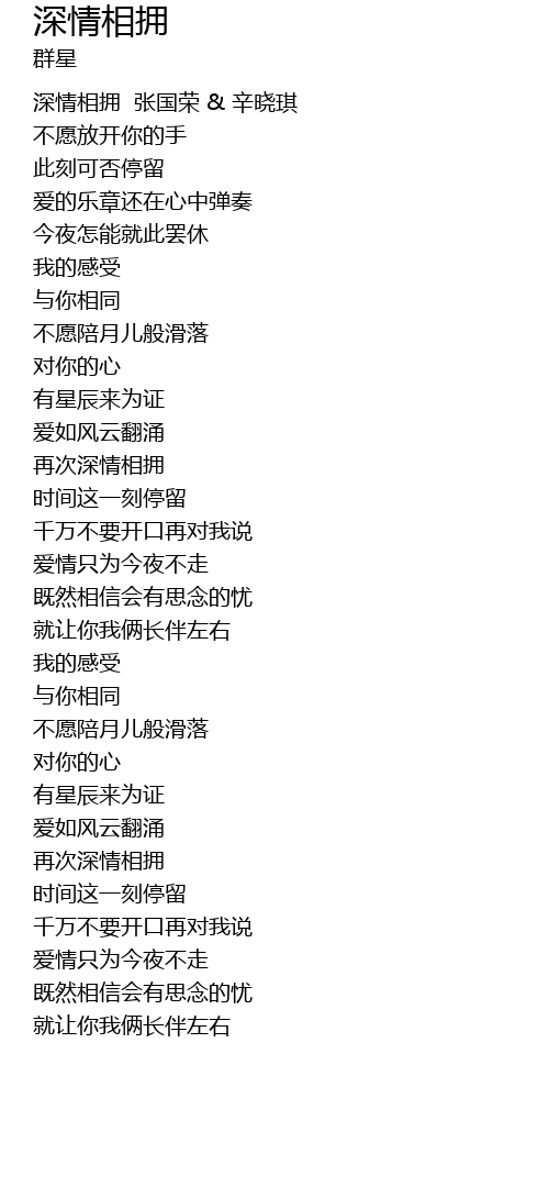 | [00:00.00] | 深情相拥 张国荣 & 辛晓琪 |