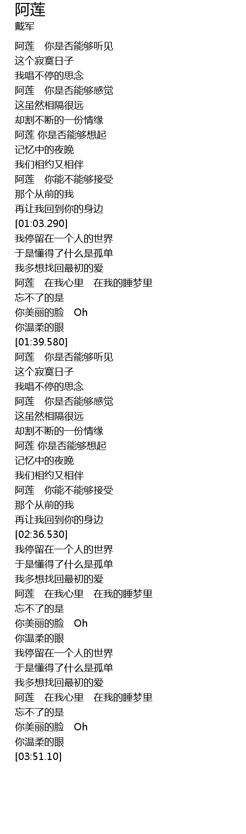 | [00:20.760] | 阿莲 你是否能够听见 |