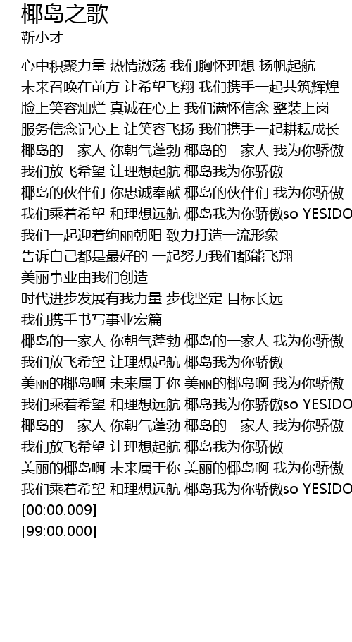 | [03:23.68] | 美丽的椰岛啊 未来属于你 美丽的椰岛啊 我为你骄傲 我们乘着希望 和理想远航 椰岛我为你骄傲so YESIDO |