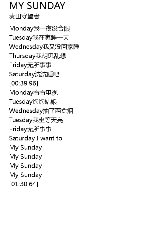 | [00:19.85] | Tuesday wǒ zài jiā shuì yì tiān |
