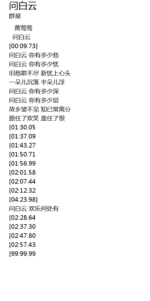 | [00:14.73] | 问白云 你有多少愁 |