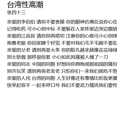 | qīn ài de tóng zhì zhōng guó de tóng bāo hǎo xiǎng tóng nǐ yōng bào wén nà zǔ guó de sāo bāo | |