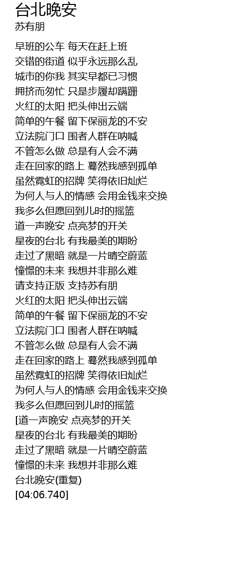 | [03:54.790] | tái běi wǎn ān chóng fù |