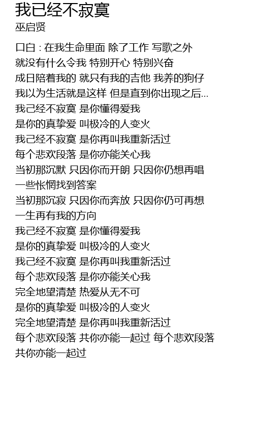 | [01:16.61] | 我己经不寂寞 是你再叫我重新活过 |