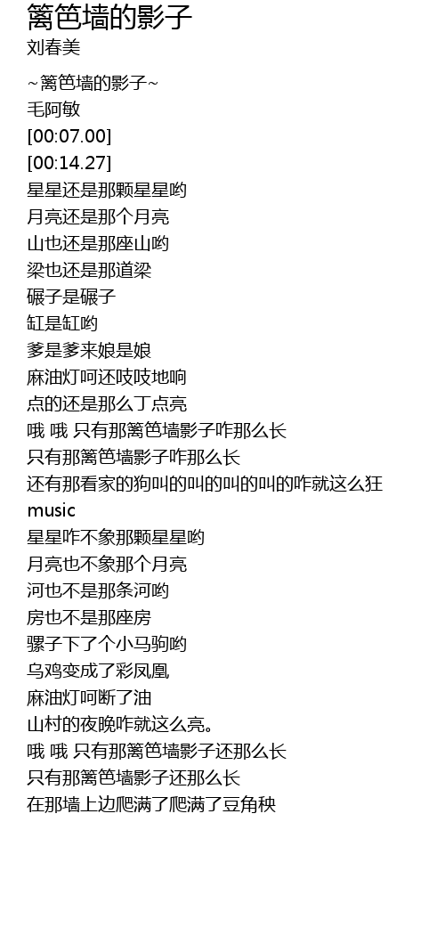 | [01:37.60] | 只有那篱笆墙影子咋那么长 |